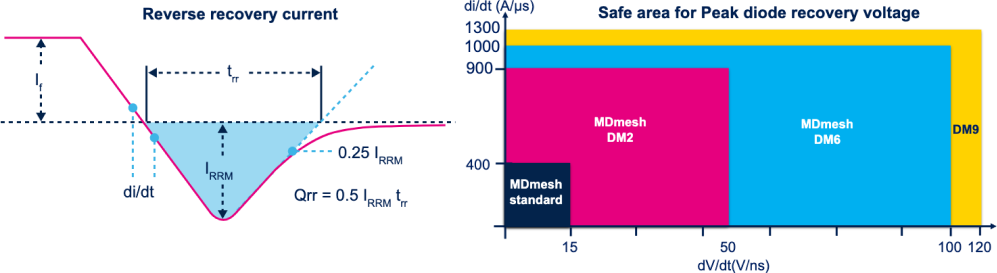 如今,MDmesh晶体管的发展为越来越多的功率转换应用带来了持续性的改进。其中的一项成果是通过引入铂离子注入等寿命控制技术,来提高集成体二极管的性能。反向恢复时间、反向恢复电荷和dV/dt(DM系列)等方面的改进为桥式和大功率相移电路带来了明显的应用优势。