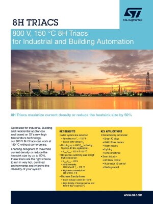 意法半导体的8H三端双向可控硅是专为热密集型重载应用而设计的高压 (800 V) 开关,具有完整的电力线性能和较强的抗干扰能力,得益于其在高达150 °C温度下不受影响的额定值,非常适合在日益紧凑的模块中驱动苛刻负载。