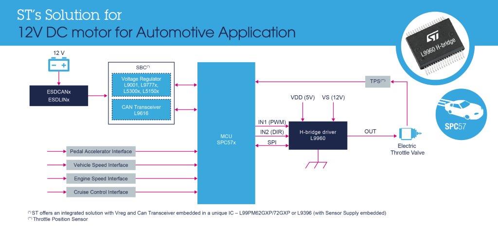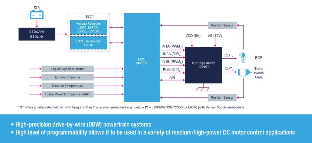 The rising demand of tough requirements reducing exhaust emission and fuel consumption is the driving force for the motor bridges proliferation, controlling various actuators based on DC motors. The L9960 series has been designed for throttle control in high precision drive-by-wire (DBW) powertrain systems allowing the implementation of the most advanced control algorithms, thanks to the high level of programmability L9960 series can be used in a variety of other medium/high power DC motor control applications.