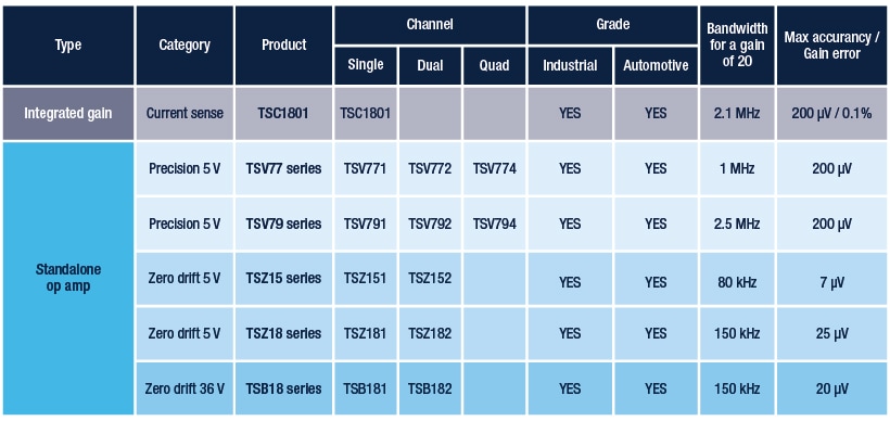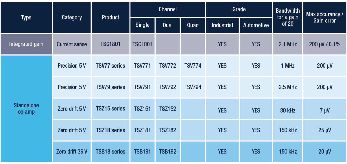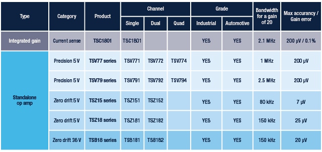 了解我们的先进精密元件产品组合:包括具有超高精度的TSZ15系列、支持双向电流检测的TSC1801B、高速低失调的TSV79系列(适用于低侧电流检测应用)以及具有极高精度的TSB18系列。