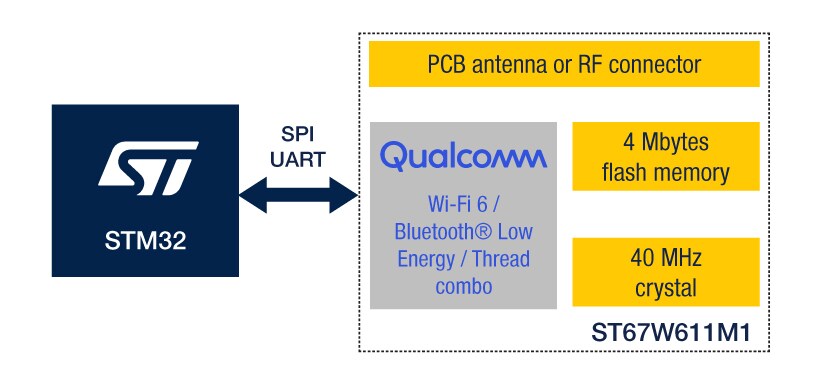 ST67W611M模块提供经认证的Wi-Fi® 6和Bluetooth® LE连接功能,可无缝集成STM32 MCU或MPU,为设备增添无线能力。产品面向未来,现支持通过软件更新实现基于Wi-Fi的Matter,而基于Thread的Matter将在2026年第三季度推出,确保与最新的物联网标准兼容。