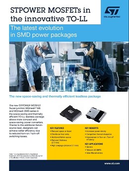 The new STPOWER MOSFET Super-junction MDmesh* M6 and MDmesh DM6 series in the space-saving and thermally efficient TO-LL leadless package allows more compact and spacesaving power converters. Thanks to the additional Kelvin-source lead, designers can achieve better efficiency due to reduced turn-on / turn-off switching losses.