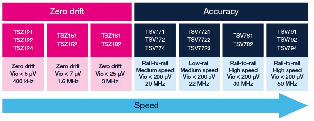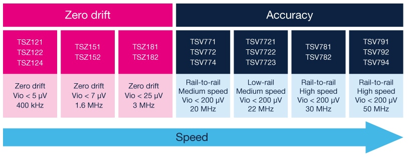 意法半导体的零漂移运算放大器基于斩波稳定式架构,可提供超低偏移电压且漂移几乎为零,对精度要求极高的应用而言堪称理想选择。TSZ系列已通过车规级认证,可在节省空间的封装(DFN、SC70、SOT23-5和MiniSO)中应用最高125 °C、150 °C或175 °C的工作温度。