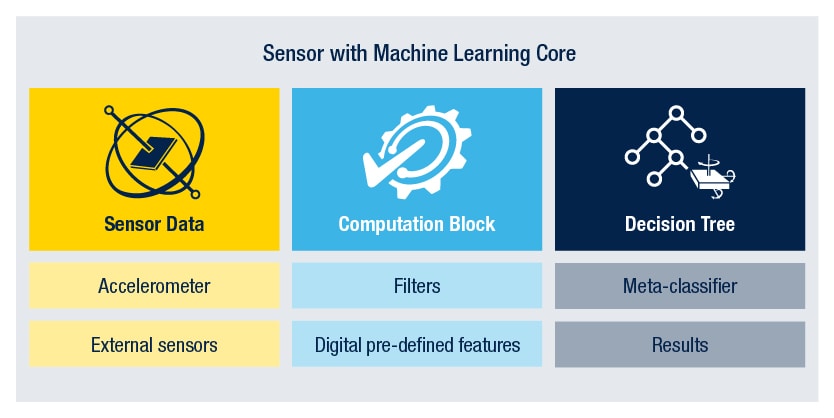 MLC是一个可利用决策树学习训练它在检测到特定事件时触发动作的引擎。通过将MLC嵌入传感器中,可实现对运动情况的精确识别,并以最佳的系统能效将事件传达给处理器。