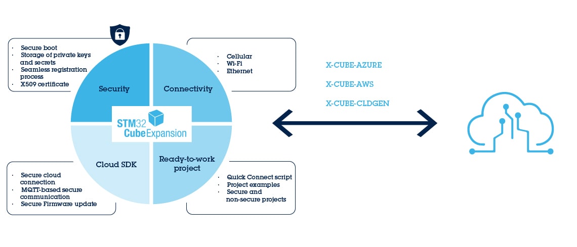 意法半导体通过STM32Cube扩展包中的预集成软件提供了一系列物联网硬件工具,并提供了强大的研发生态系统以及入门套件。这些解决方案使开发人员能够轻松、安全地将物联网设备连接到需要监控和管理数十亿物联网设备的云平台。
