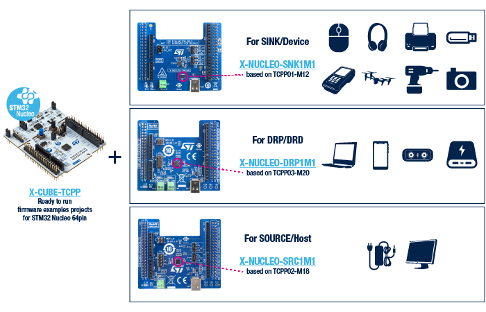 | Nucleo开发板 Nucleo屏蔽 | X-NUCLEO-SNK1M1 X-NUCLEO-DRP1M1 X-NUCLEO-SRC1M1 | X-NUCLEO-SNK1M1 X-NUCLEO-DRP1M1 X-NUCLEO-SRC1M1 | NUCLEO-L552ZE-Q 1个SNK端口 | NUCLEO-U575ZI-Q 1个SNK端口 | NUCLEO-H563ZI 1个受电端口 | NUCLEO-H7S3L8 1个DRP端口 |