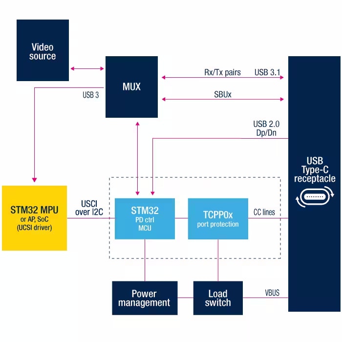 在基于Windows或Linux且使用片上系统 (SoC)、应用处理器或STM32 MPU器件作为主处理器的架构中,面向USB Type-C®的STM32解决方案符合USB Type-C连接器系统接口规范 (UCSI)。