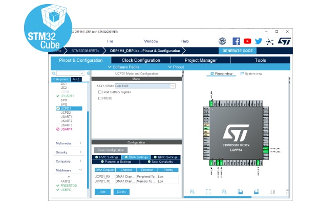 - 使用STM32CubeMX选择并配置STM32 UCPD控制器