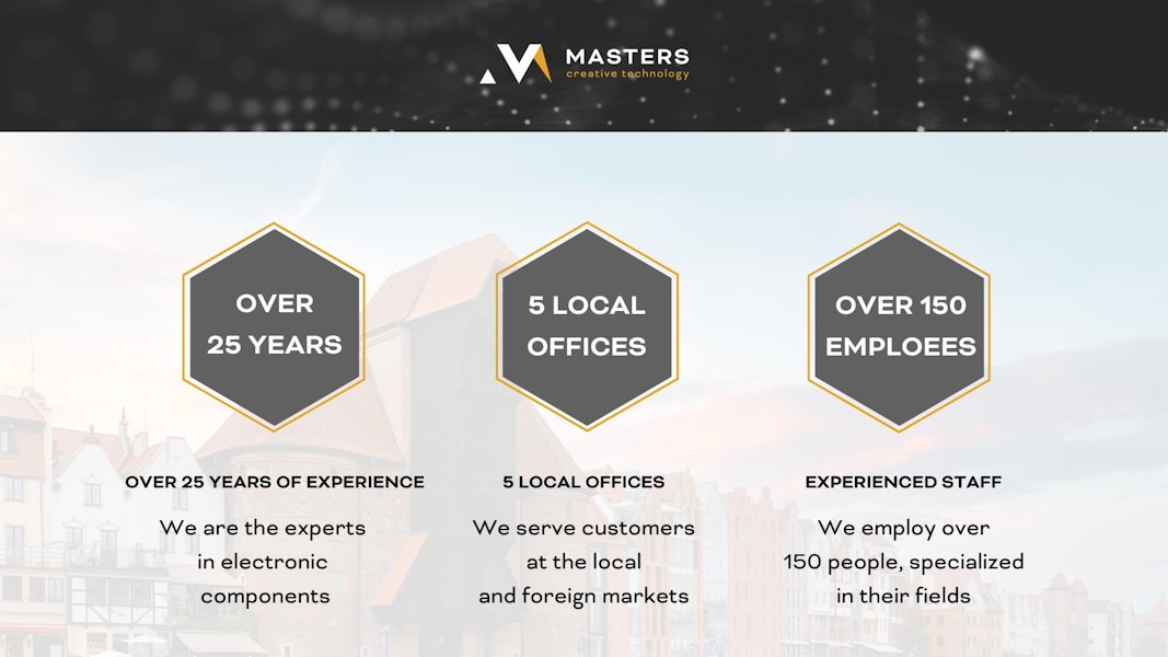 MASTERS is one of the largest and most frequently chosen distributor of electronic components in Poland. They have their own R&D Department, production lines, both SMT and THT, training center and marketing department. Customers receive full technical support at every stage of the project. MASTERS services and solutions are tailored to the needs of clients, combining comprehensive services with the latest technologies by focusing on providing a wide portfolio of electronic components and extensive customer support.