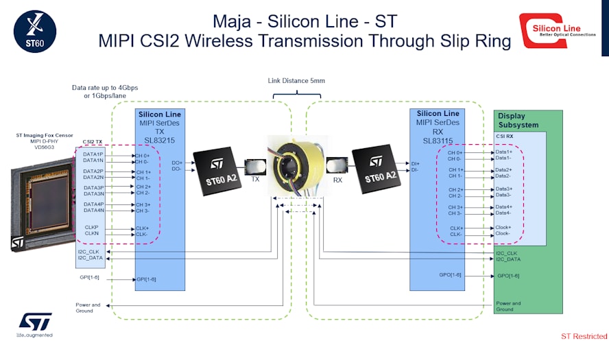 Their MIPI D-PHY SerDes ICs, with STMicroelectronics’s ST60A2 - an RF millimeter-wave transceiver operating in the 60 GHz V-Band—facilitate the wireless transmission of MIPI camera module and display video signals. The collaboration between Silicon Line and STMicroelectronics provides a power-efficient, high data-rate wireless link, eliminating the need for physical cables and connectors for short-range (a few cm) point-to-point communications.