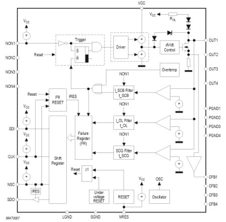 The Quad Driver is an integrated quad low-side power switch with power limitation, load interrupt and shorted load detection, thermal shutdown, error detection via SPI interface and integrated Z-diodes for output clamping, free running diodes.