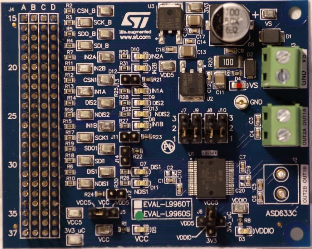 The EVAL-L9960 and EVAL-L9960T are the simplest solution to evaluate respectively the L9960 and L9960T functionalities providing all the inputs and outputs capabilities necessary to drive DC motors and monitor diagnostic functions.