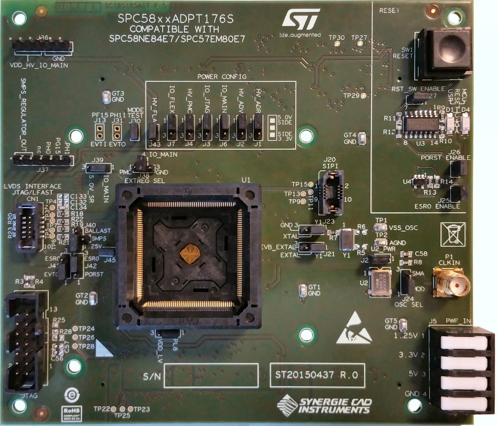 The SPC58XXADPT176S Premium Evaluation Boards System supports the 32-bit SPC58EE84E7, SPC58NE84E7, SPC58EN84E7, SPC58EG84E7 and SPC58NG84E7 STMicroelectronics' automotive microcontrollers.