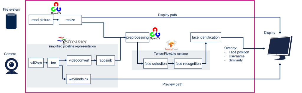 从相机输入 (/dev/videox) 获取帧并由两个神经网络模型(面部检测和面部识别)通过TensorFlow™ Lite运行时框架进行处理。 。