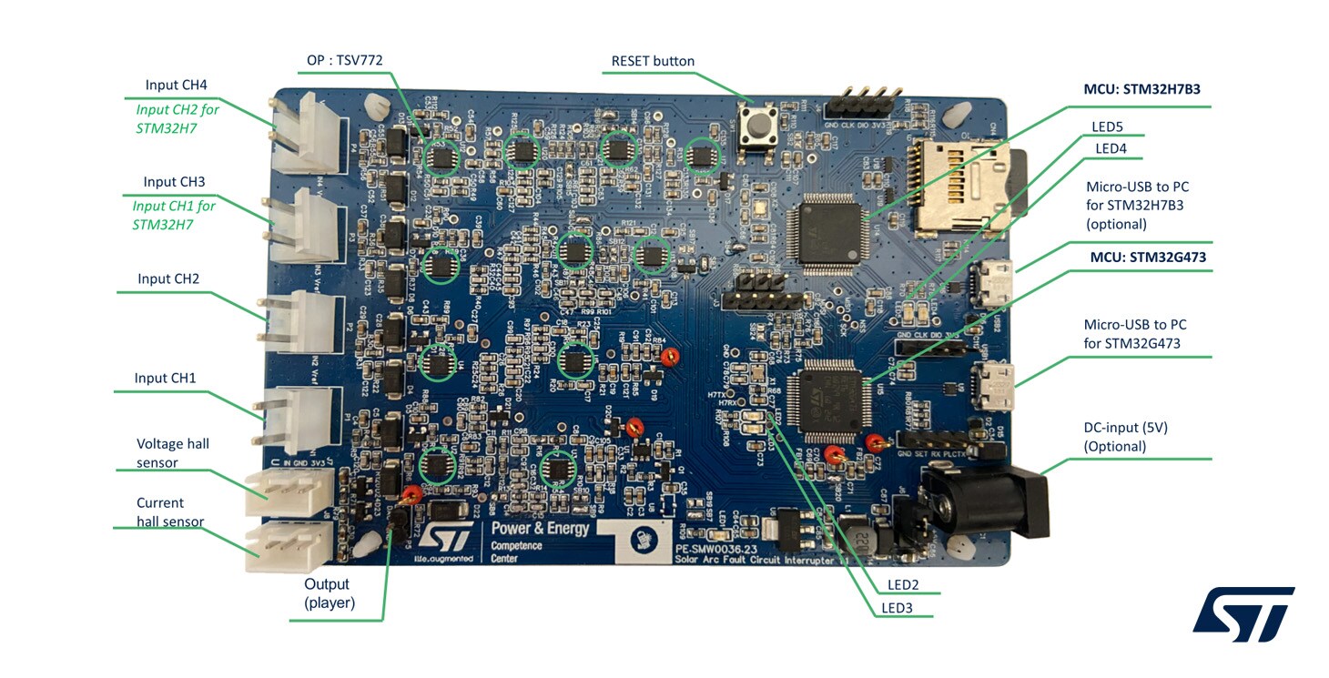 • 在此演示中,我们使用了以STM32G4为核心的定制电弧故障电路断路器 (AFCI) 开发板。