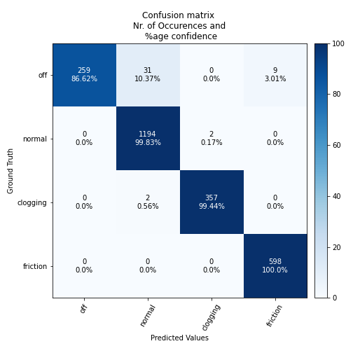 每981毫秒,将 (46×32) MFCC声谱图输入到USC卷积神经网络输入。 模型将异常分为四类:【关闭、正常、堵塞、摩擦'】。 该模型创建用于USB风扇,当风扇以最大速度运行时效果较好,但在其他速度测试时则效果不太理想。