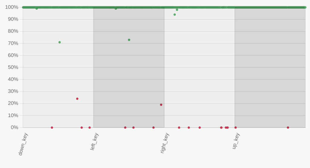 绿点表示分类正确的信号。 红点表示分类不正确的信号。 类别位于横坐标,预测置信度显示在纵坐标上
