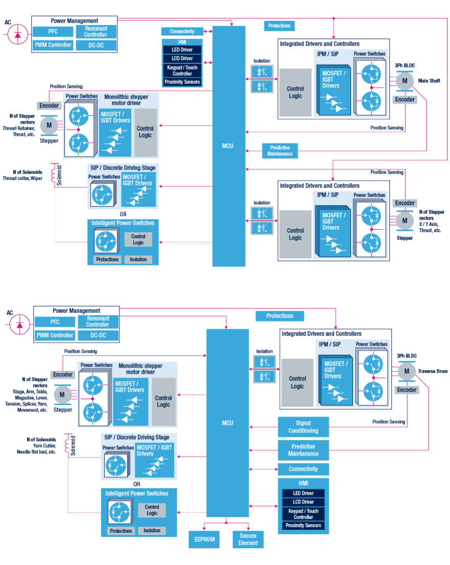 我们拥有品类齐全的功率MOSFET、智能电源模块 (IPM)、栅极驱动器、单片式电机驱动器、用于设计高效电机控制解决方案的高性能STM32微控制器、众多AC-DC和DC-DC电源管理和供电解决方案、一系列运动/接近/测距传感器以及连接解决方案,可帮助客户设计高性能纺织装备。