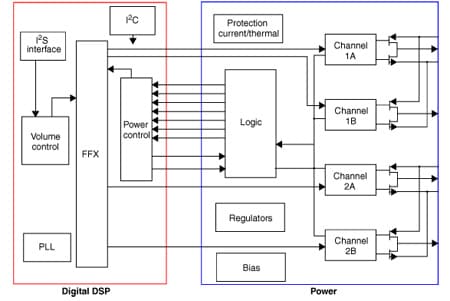 - 2.1 channels of binary PWM (left, right, LFE) (2 x 9 W into 4 Ω +1 x 20 W into 8 Ω at 18 V)