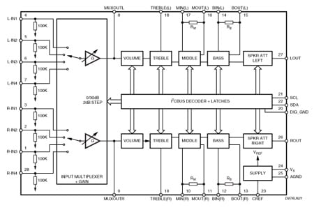 The TDA7439DS is a volume, tone (bass, mid-range and treble) and balance (left/right) processor for quality audio applications in car-radio and Hi-Fi systems. Selectable input gain is provided. All the functions are controlled by serial bus.