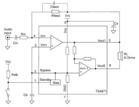 The TS4871 has been designed for high quality audio applications such as mobile phones and to minimize the number of external components.