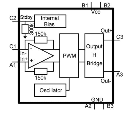 - Output power: 2.3 W @5 V or 0.75 W @ 3.0 V into 4 Ω with 1 % THD+N max.