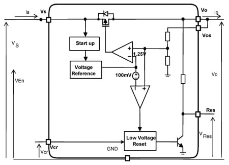 The output voltage regulating element consists of a p-channel MOS and regulation is performed regardless of input voltage transients of up to 40V.