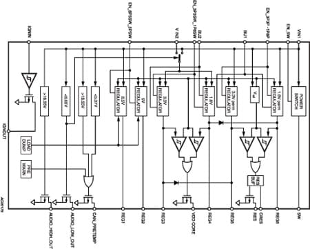 The L5958 includes 6 linear voltage regulators and a 2 A power switch, working down to 4.5 V battery level. All the voltage regulators can be switched off through the three enable pins.