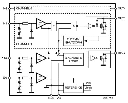 The L93PI is a monolithic integrated quad low side driver realized in advanced Multipower-BCD technology. It is intended to drive lines, lamps or relais in automotive or industrial applications.