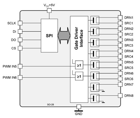 In addition, 2 outputs are capable of being PWMed via an external pin (outputs 5-6). The integrated standard serial peripheral interface (SPI) controls all outputs and provides diagnostic information.