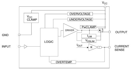 Active VCCpin voltage clamp protects the device against low energy spikes (see ISO7637 transient compatibility table). This device integrates an analog current sense which delivers a current proportional to the load current (according to a known ratio).