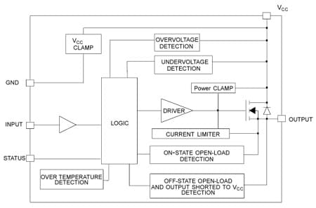 The device detects open load condition in on and off-state. Output shorted to VCCis detected in the off-state. Device automatically turns off in case of ground pin disconnection.