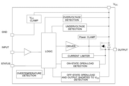Active current limitation combined with thermal shutdown and automatic restart protects the device against over-load. The device detects the open-load condition in both the on-state and off-state. In the off-state the device detects if the output is shorted to VCC. The device automatically turns off in the case where the ground pin becomes disconnected.