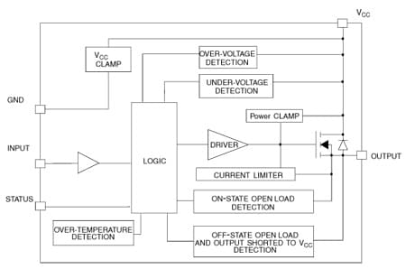 The device integrates an analog current sense output which delivers a current proportional to the load current. The device automatically turns off in the case where the ground pin becomes disconnected.