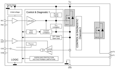 The devices integrate advanced protective functions such as load current limitation, inrush and overload active management by power limitation, over-temperature shut-off with auto-restart and over-voltage active clamp. A dedicated analog current sense pin is associated with every output channel in order to provide Ehnanced diagnostic functions including fast detection of overload and short-circuit to ground through power limitation indication, overtemperature indication, short-circuit to VCC diagnosis and on & off state open load detection.