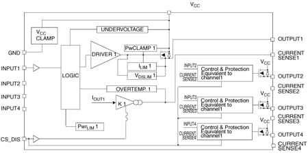 This device integrates an analog current sense which delivers a current proportional to the load current (according to a known ratio) when CS_DIS is driven low or left open. When CS_DIS is driven high, the CURRENT SENSE pin is in a high impedance condition.