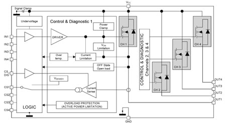 A dedicated analog current sense pin is associated with every output channel providing enhanced diagnostic functions including fast detection of overload and short-circuit to ground through power limitation indication, overtemperature indication, short-circuit to VCCdiagnosis and on-state and off-state open-load detection. The current sensing and diagnostic feedback of the whole device can be disabled by pulling the CS_DIS pin high to share external sense resistor with similar devices.