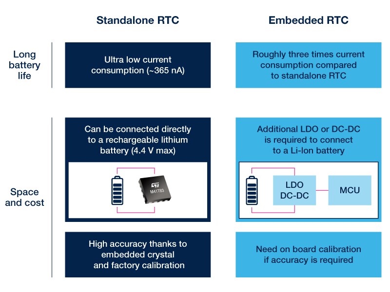 在由一次性电池供电的系统中,当更换电池时,独立RTC可以使用小型电容器保持时间。RTC也可以直接连接到电池,在PCB上占用有限的空间即可提供所有功能,同时提高系统的安全性。