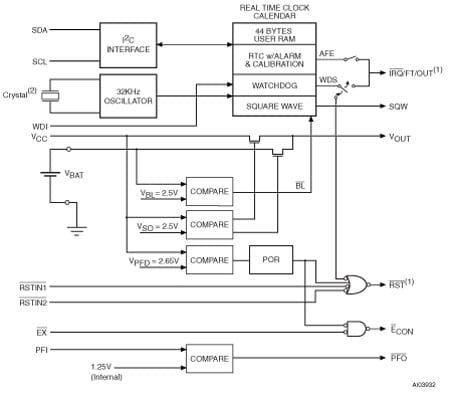 Functions available to the user include a non-volatile, time-of-day clock/calendar, alarm interrupts, watchdog timer, and programmable squarewave generator. Other features include a power-on reset as well as two additional debounce reset inputs (RSTIN1and RSTIN2) which can also generate an output reset (RST).