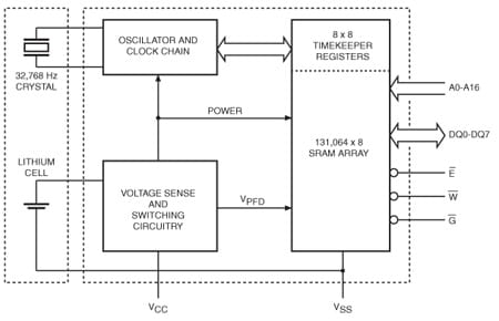 It also provides the non-volatility of Flash without any requirement for special WRITE timing or limitations on the number of WRITEs that can be performed. The 32-pin, 600 mil DIP hybrid houses a controller chip, SRAM, quartz crystal, and a long-life lithium button cell in a single package.