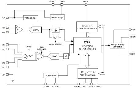 The STPM01 is designed for effective measurement of active, reactive and apparent energy in a power line system using Rogowski coil, current transformer and shunt sensors. This device can be implemented as a single chip monophase energy meter or as a peripheral measurement in a microcontroller based monophase or 3-phase energy meter. The STPM01 consists, essentially, of two parts: the analog part and the digital part. The former, is composed by preamplifier and 1storder Δ ∑ A/D converter blocks, band gap voltage reference, low drop voltage regulator, the latter, is composed by system control, oscillator, hard wired DSP and SPI interface. There is also an OTP block, which is controlled through the SPI by means of a dedicated command set. The configured bits are used for testing, configuration and calibration purpose. From a pair of Δ ∑ output signals coming from analog section, a DSP unit computes the amount of consummated active, reactive and apparent energy, RMS and instantaneous values of voltage and current. The results of computation are available as pulse frequency and states on the digital outputs of the device or as data bits in a data stream, which can be read from the device by means of SPI interface. This system bus interface is used also during production testing of the device and/or for temporary or permanent programming of bits of internal OTP. In the STPM01 an output signal with pulse frequency proportional to energy is generated, this signal is used in the calibration phase of the energy meter application allowing a very easy approach. When the device is fully configured and calibrated, a dedicated bit of OTP block can be written permanently in order to prevent accidental entering into some test mode or changing any configuration bit.