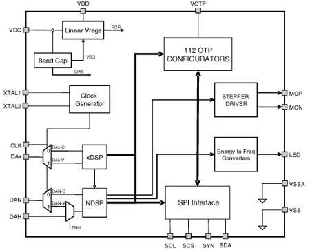 The STPMC1 device functions as an energy calculator and is an ASSP designed for effective energy measurement in power line systems utilizing Rogowski, current transformer, Shunt or Hall current sensors. Used in combination with one or more STPMSx ICs, it implements all the functions needed in a 1-, 2- or 3-phase energy meter. It can be coupled with a microprocessor for multi-function energy meters, or it can directly drive a stepper motor for a simple active energy meter. The calculator has five input data pins. The first three receive the voltage and current information of the phases. In fact, each data input processes two ΔΣ signals, multiplexed in time and generated by the STPMSx device. The fourth input receives multiplexed ΔΣ signals also, and can be used to sense the neutral current or another signal - temperature, for example. The fifth input data pin accepts non-multiplexed ΔΣ signals and it can be used for sensing the magnetic field information from a Hall sensor. Four internal hard-wired DSP (digital signal processing) units perform all the computations on the ΔΣ streams in real time by means of ΔΣ arithmetic blocks. This allows the achievement of very high computation precision with fast and efficient digital architecture. All the data recorded by the STPMC1 are accessible through an SPI port, which is also used to configure and calibrate the device. The configuration and calibration data can be saved in a 112-bit OTP block, or dynamically set in microprocessor-based meters.