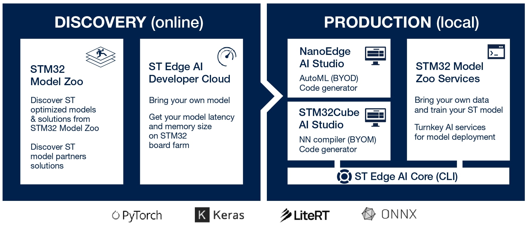 Edge AI tools enable the deployment of machine learning models directly on ST devices, such as STM32 microcontrollers (MCUs) and microprocessors (MPU) bringing intelligence directly to the edge.