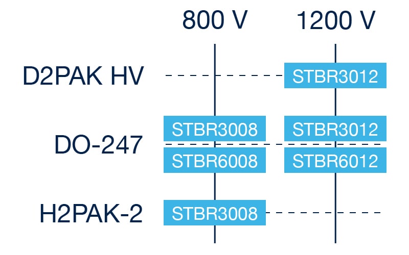 Our STBR3012 (30 A) STBR6012 (60 A) high-voltage rectifiers are designed to comply with international creepage requirements in heavy-duty applications that demand long-term reliability, especially for on board chargers in automotive applications and for all SMPS and UPS solutions in industrial applications.