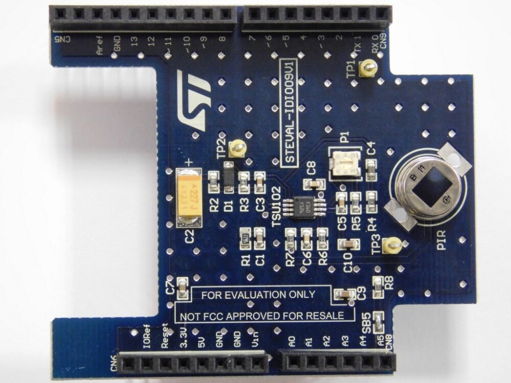 The STEVAL-IDI009V1 evaluation board conditions the signal generated by a passive infrared (PIR) sensor, for common applications like human detection. A person in range of the sensor triggers a detection event, which can in turn be used to trip an alarm or command room lighting to be turned on, for example.