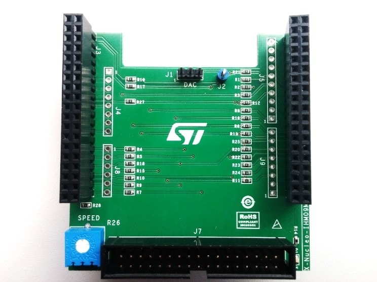 The X-NUCLEO-IHM09M1 is a motor control connector expansion board for STM32 Nucleo. It provides an easy way to evaluate motor control solutions for three-phase motors by adapting the STM32 Nucleo board with an external ST motor control power board, thanks to ST morpho and motor control connector. The 34-pin motor control connector is compatible with all major ST motor control power boards, requiring an external digital section (MCU) to drive a three-phase motor. The DAC connector supports user code development and testing with easy access to the MCU peripherals. A LED is available for fault condition signaling or status indication.