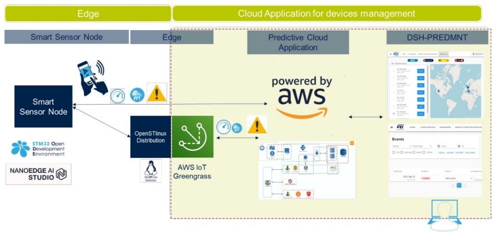 The cloud package can receive and process data streamed directly from compatible ST sensor nodes with real-time data preprocessing capabilities, such as Fast Fourier Transforms (FFT). It also provides SDKs for the AWS Greengrass service to interface with edge gateways that manages compatible ST devices, which preprocess and store bulk data.