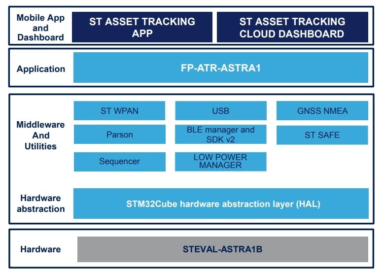 The FP-ATR-ASTRA1 is an STM32Cube function pack that implements a complete asset tracking application, which supports long-range connectivity and short-range connectivity. This application reads the data from the environmental and motion sensors, retrieves the geo-position from GNSS and sends them to the cloud using Bluetooth® Low Energy and LoRaWAN connectivity.