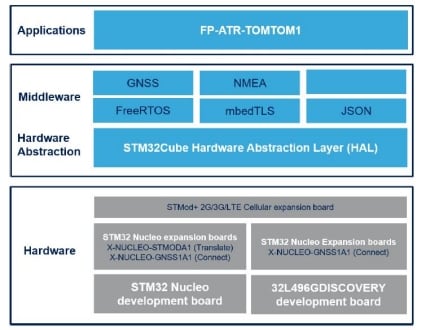 FP-ATR-TOMTOM1 is an STM32Cube function pack which lets you connect your IoT node to a cellular network and send positioning coordinates, provided by a global navigation satellite system (GNSS) receiver, to TomTom online services. These coordinates are used to perform Reverse Geocoding which is the translation into a street address.