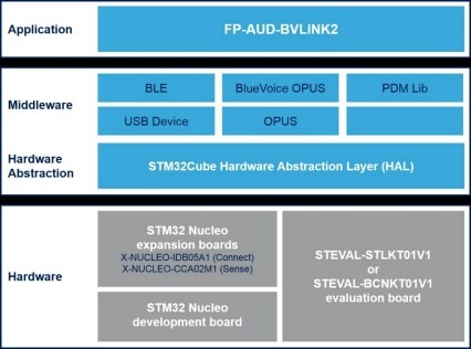 FP-AUD-BVLINK2 is an STM32Cube function pack that performs voice streaming over BLE in a full-duplex configuration using the advanced Opus compression algorithm. The application runs on the STM32 Nucleo and includes drivers and middleware for BLE (BlueNRG-MS) and digital MEMS microphones.
